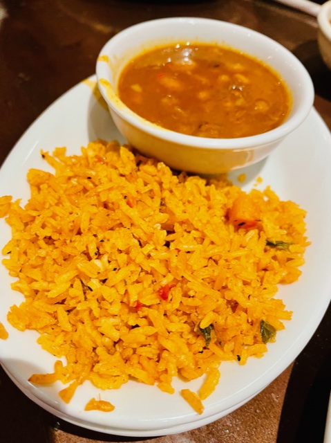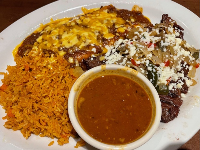 Top: Cheese and Onion Enchilada; Rice and Bean